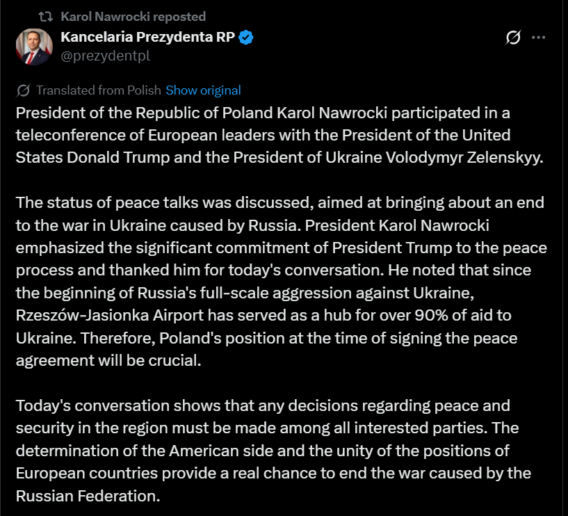 Karol Nawrocki, Lengyelország elnöke a közösségi médiában mondott köszönetet Donald Trumpnak a hívásért. Ugyanakkor figyelmeztetett, hogy a régió békéjéről és biztonságáról szóló bármilyen megállapodást az összes érintett fél részvételével kell megtárgyalni. Hozzátette, hogy Lengyelország álláspontja kulcsfontosságú, és többször leszögezte, hogy az ukrajnai háborúért Oroszország felelős.