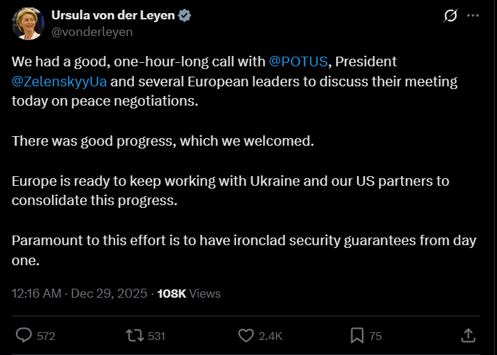 Az Európai Bizottság elnöke, Ursula von der Leyen az X-en közzétett bejegyzésében „fontos haladásról” számolt be a tárgyalások nyomán. Kijelentette, hogy Európa készen áll a munka folytatására Ukrajnával és az amerikai partnerekkel ezen eredmények megszilárdítása érdekében. Von der Leyen hangsúlyozta, hogy a szilárd biztonsági garanciák minden megállapodás alapvető elemét kell, hogy képezzék az első naptól kezdve.